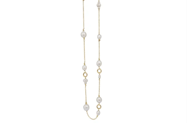 Forkæl dig selv med Rabinovich Melrose collieret i sølv forgyldt design, prydet med elegante ferskvandsperler. Et tidløst smykke, der tilføjer stil og elegance til enhver påklædning.
