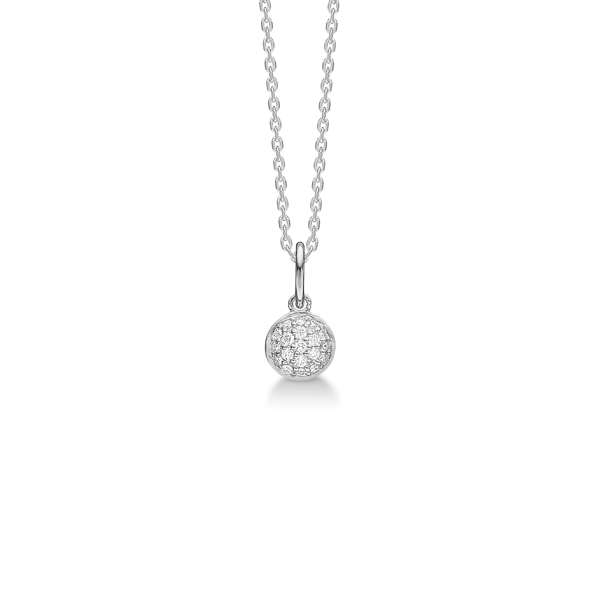 Dome-halskæde i sterlingsølv med brillantslebne hvide topaser, skulpturelt 6 mm vedhæng balanceret mellem bløde kurver og moderne æstetik.