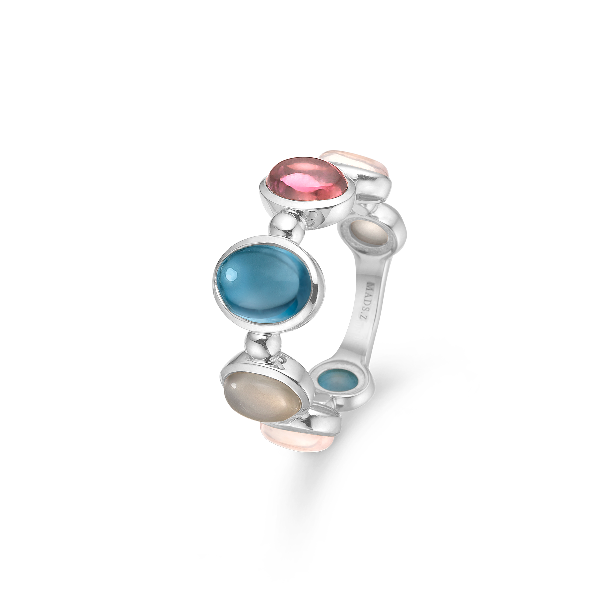 Florentina-ring i sølv med rosakvarts, månesten, London Blue topas og turmalin.