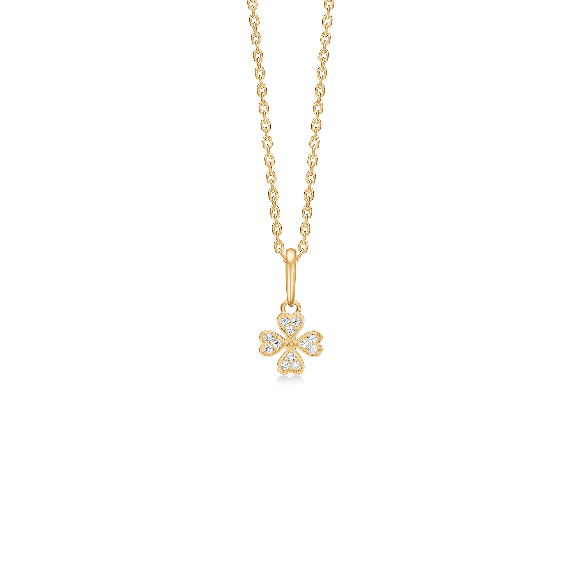 Petite Clover-vedhæng i 8 karat guld med zirkonia, elegant formgivet til alle anledninger. Måler 7 mm.
