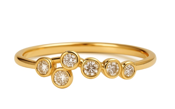Designet har et elegant og moderne udtryk, hvor diamanterne er placeret i runde fatninger langs ringskinnen.