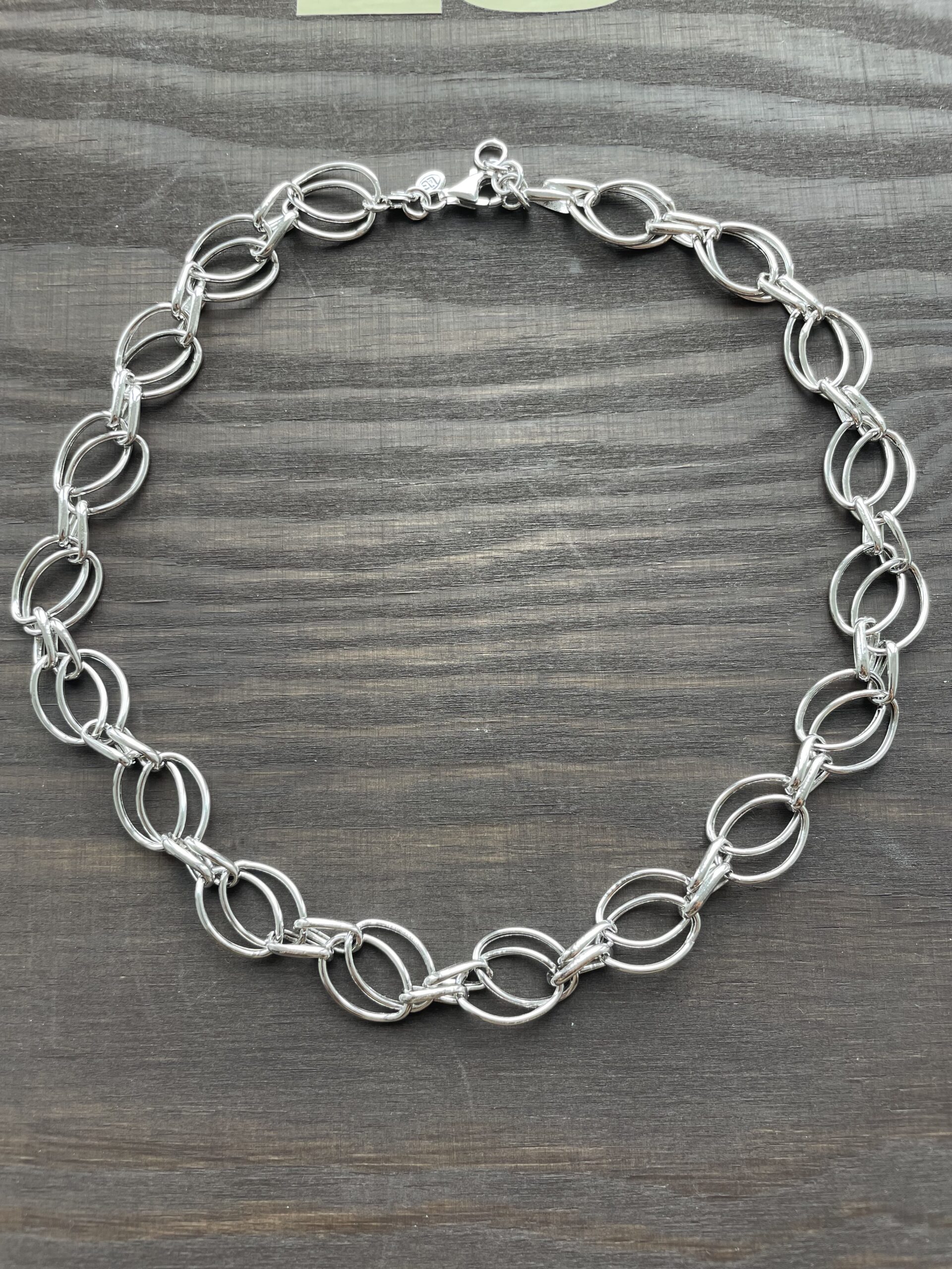 De åbne, sammenkoblede former giver kæden karakter og volumen, samtidig med at designet fremstår stilrent og tidløst.