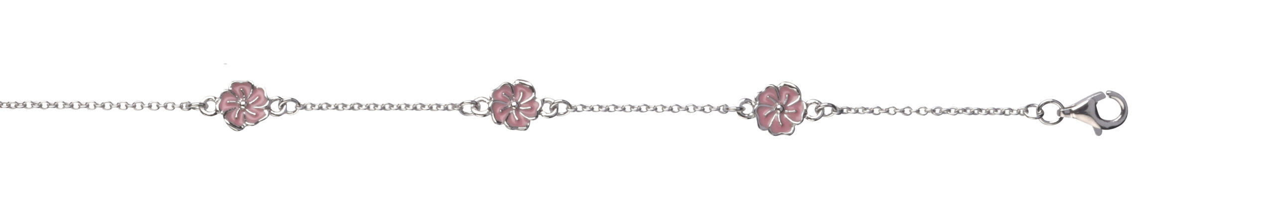 Et sødt og feminint armbånd pyntet med tre små rosa blomster, der giver et let og romantisk udtryk.