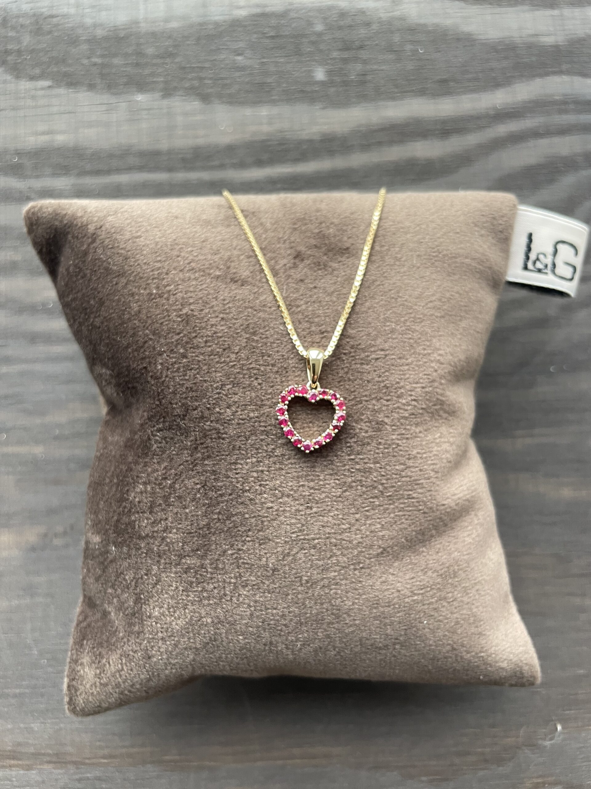 Smukt og klassisk hjertevedhæng fra L&G udført i 14 kt guld og besat med rubiner, der giver smykket et varmt og eksklusivt udtryk.