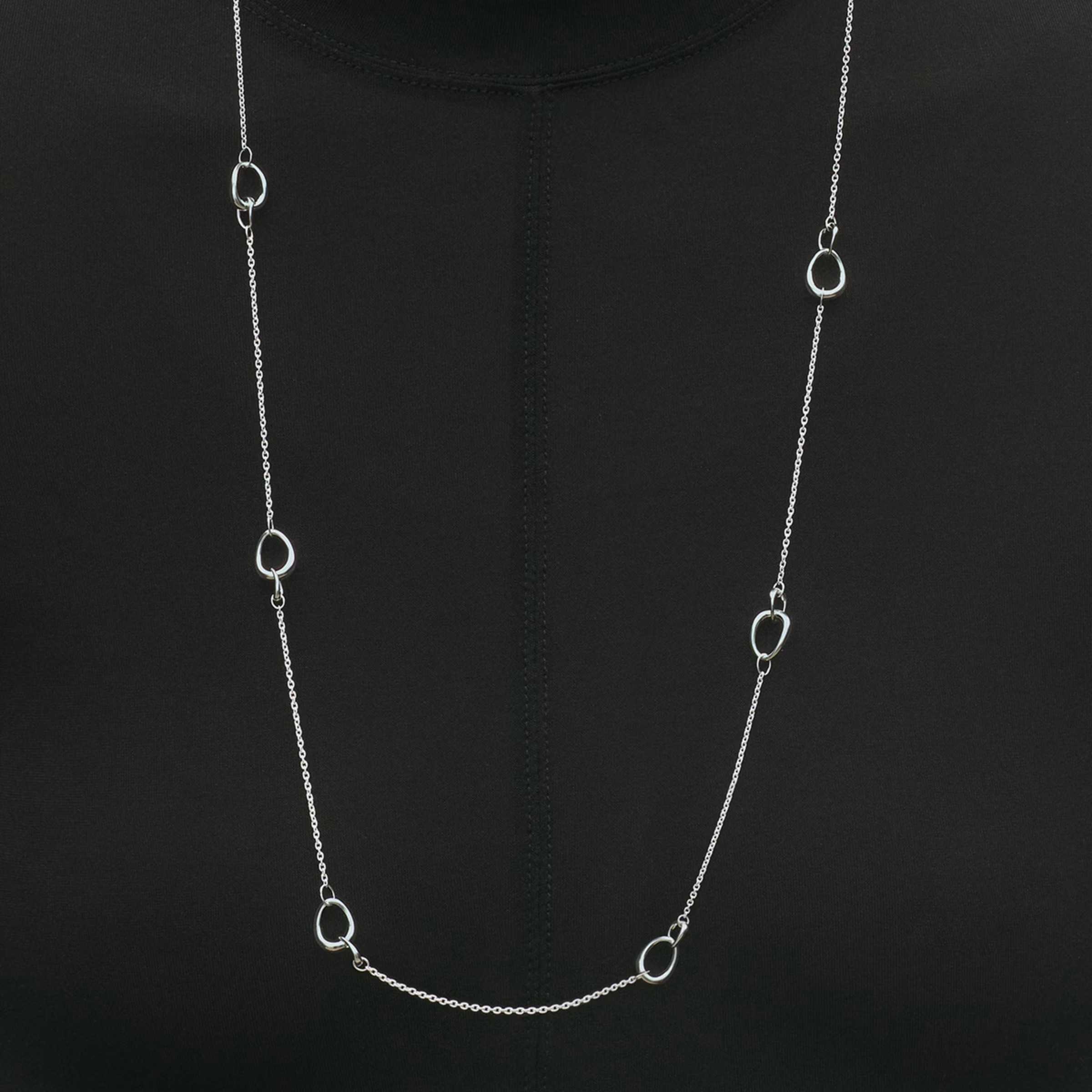 Den lange, slanke kæde er dekoreret med organiske, ovale ringe, der fordeler sig jævnt langs halskæden og skaber et let og elegant udtryk.