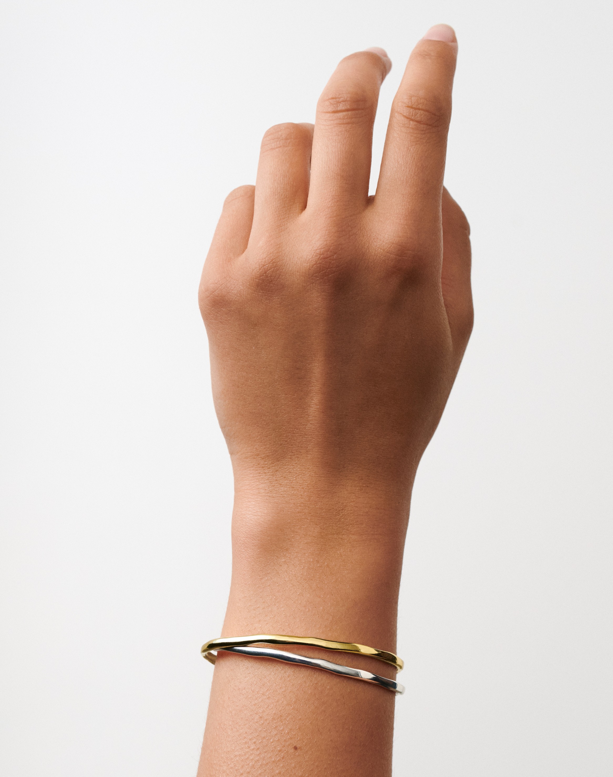 Spirit Bracelet er et elegant bangle-armbånd med bløde, bølgende kurver, der smukt afrunder armbåndets kanter. De fine kurver reflekterer lyset på en levende måde og giver armbåndet en unik overflade, der gør det både stilfuldt og iøjnefaldende – perfekt som statementsmykke der tilføjer subtil elegance.