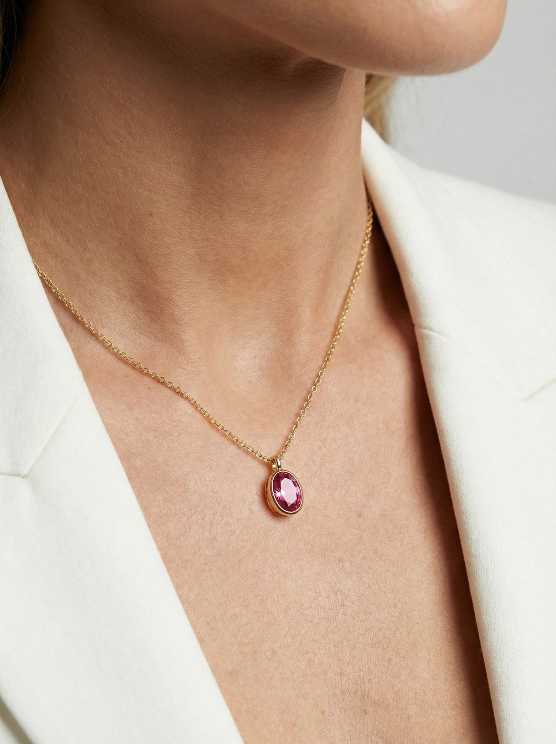 Sardinien Ovale-halskæden fra Sif Jakobs Jewellery er fremstillet af 18 karat forgyldt sterlingsølv med en poleret overflade og en håndsat, facetslebet pink zirkon.