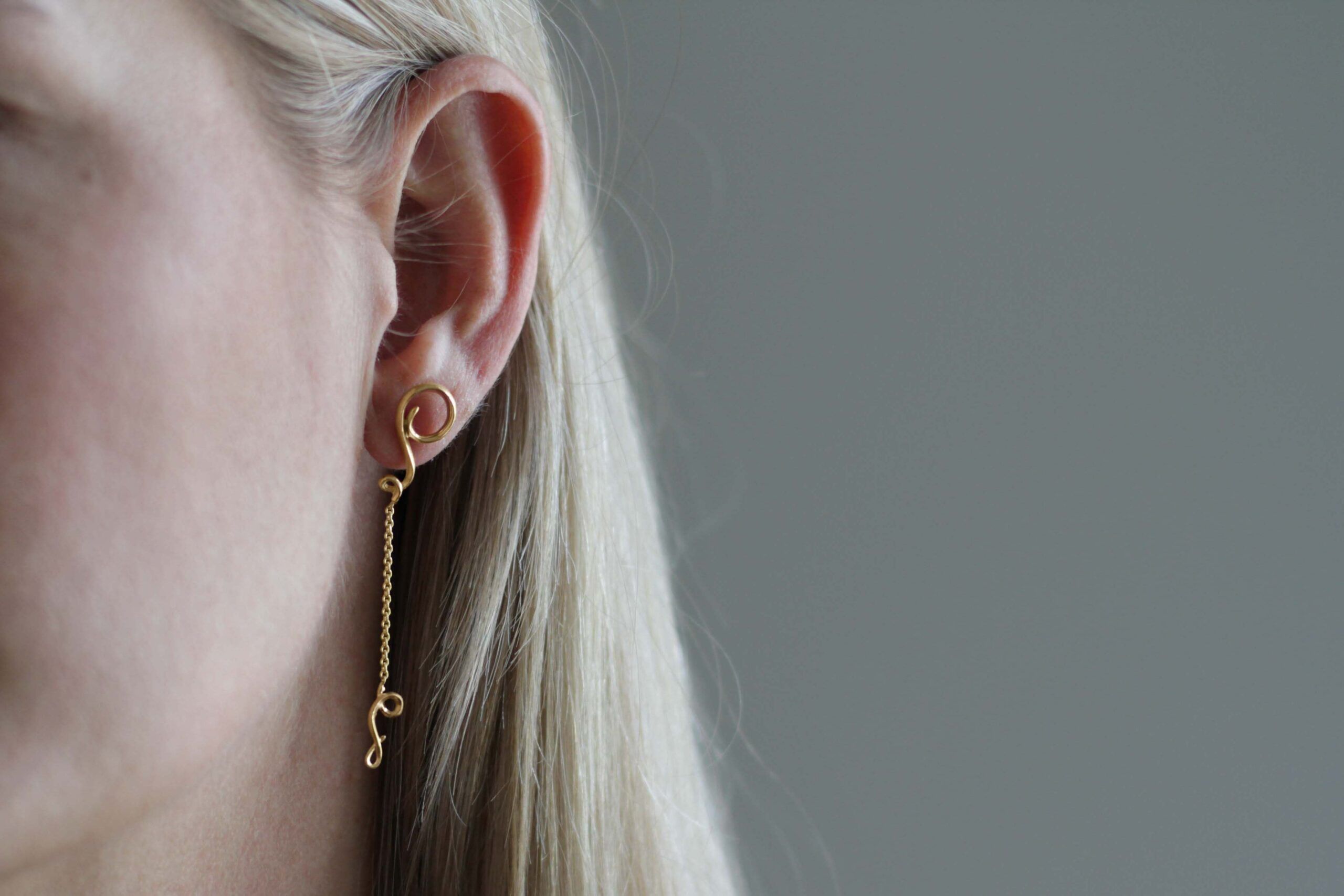 Calligraphy-øreringene fra Per Borup Design er formet som elegante, håndskrevne streger i guld, der fanger bevægelsen fra kalligrafiens bløde linjer. Den nederste del kan hænge frit ned som på billedet, eller den kan sættes op på en ørestik i hul nummer to, så udtrykket ændrer sig. Et smykke med både poesi og fleksibilitet – skabt til at følge din personlige stil.
