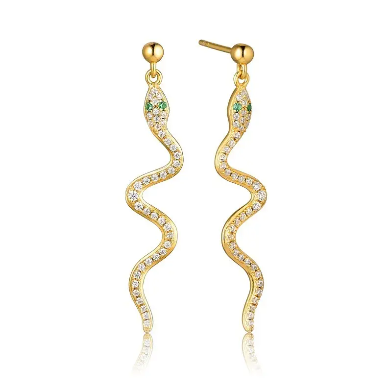 Slangeformede øreringe i forgyldt sølv fra Blicher Fuglsang, dekoreret med hvide og grønne zirkonia.