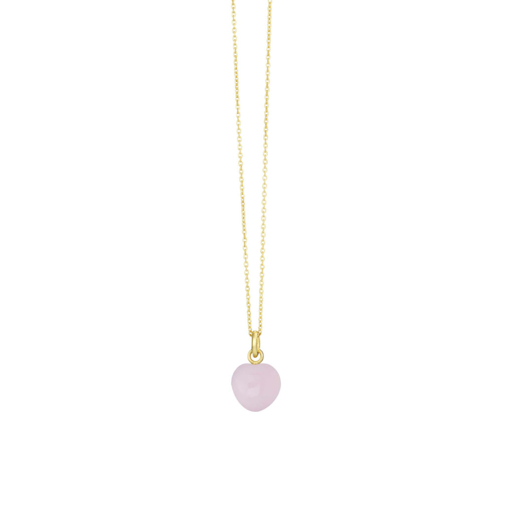 Halskæde fra Susanne Friis Bjørner bestående af en fin, tynd ankerkæde i forgyldt sterlingsølv med et 8 mm hjerteformet vedhæng af lyserød krystal.