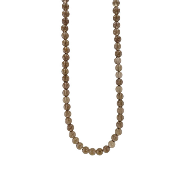 Smuk og elegant halskæde fra Susanne Friis Bjørner. Halskæden er sammensat af 8 mm blanke røgkvartskugler samt lås og forlængerstykke i forgyldt sterlingsølv.