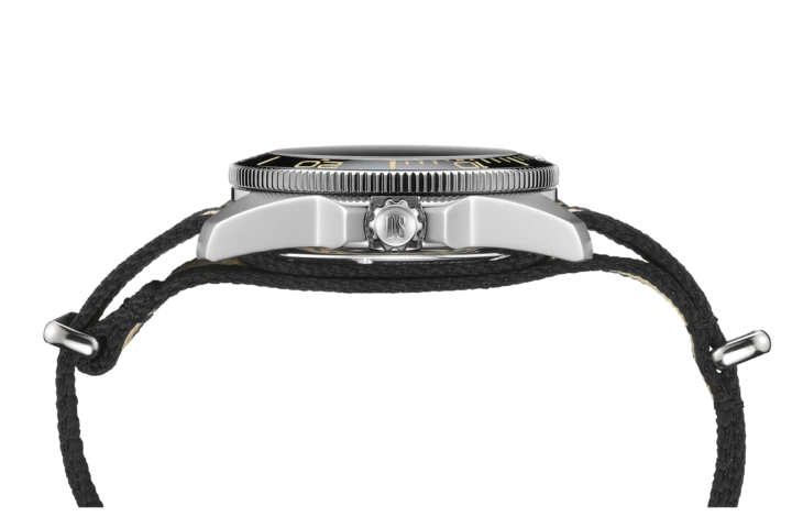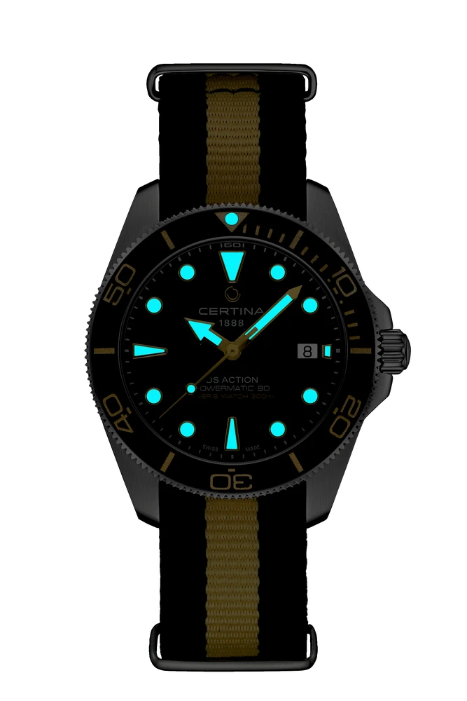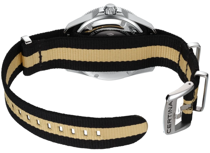 Robust DS Action Diver 40,5 mm. herreur med sort skive og sort/beige NATO-rem fra Certina.
