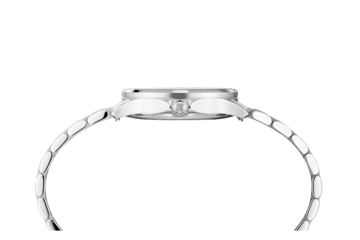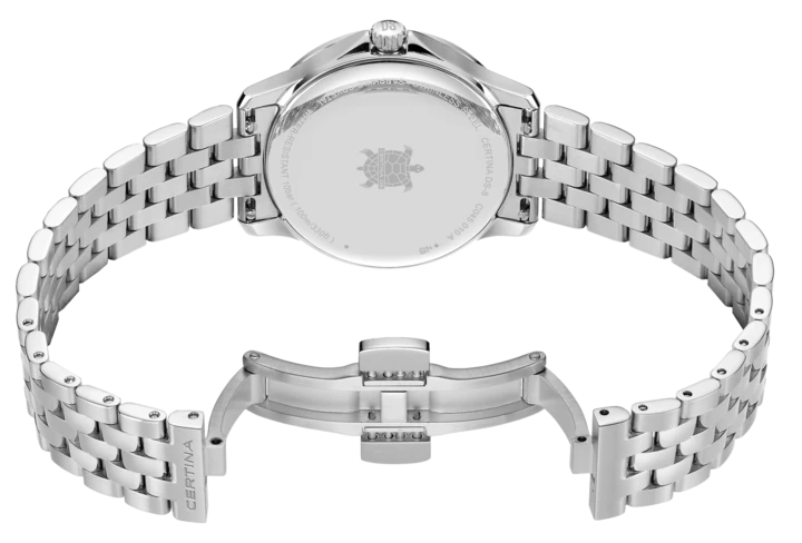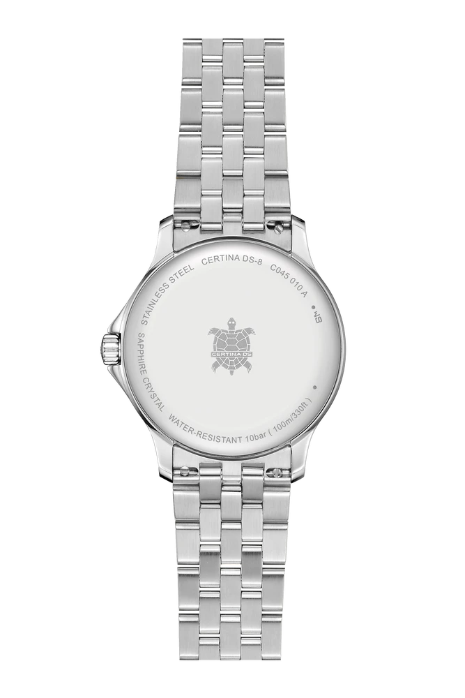 Elegant DS-8 Lady dameur i stål med hvid skive og lænke fra Certina. Uret er fremstillet i rustfrit 316L stål med hvid skive og safirglas med antirefleksbehandling. Værket er et schweizisk quartz Precidrive med End of Life-indikator, som sikrer høj præcision og pålidelighed.